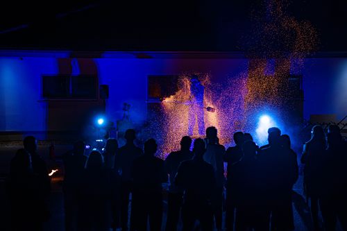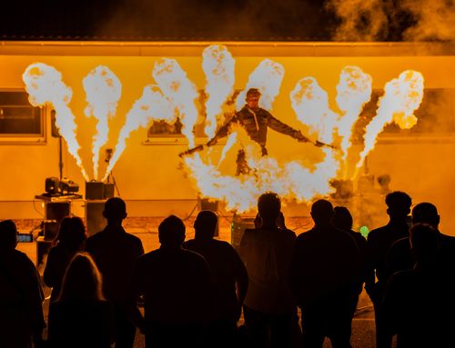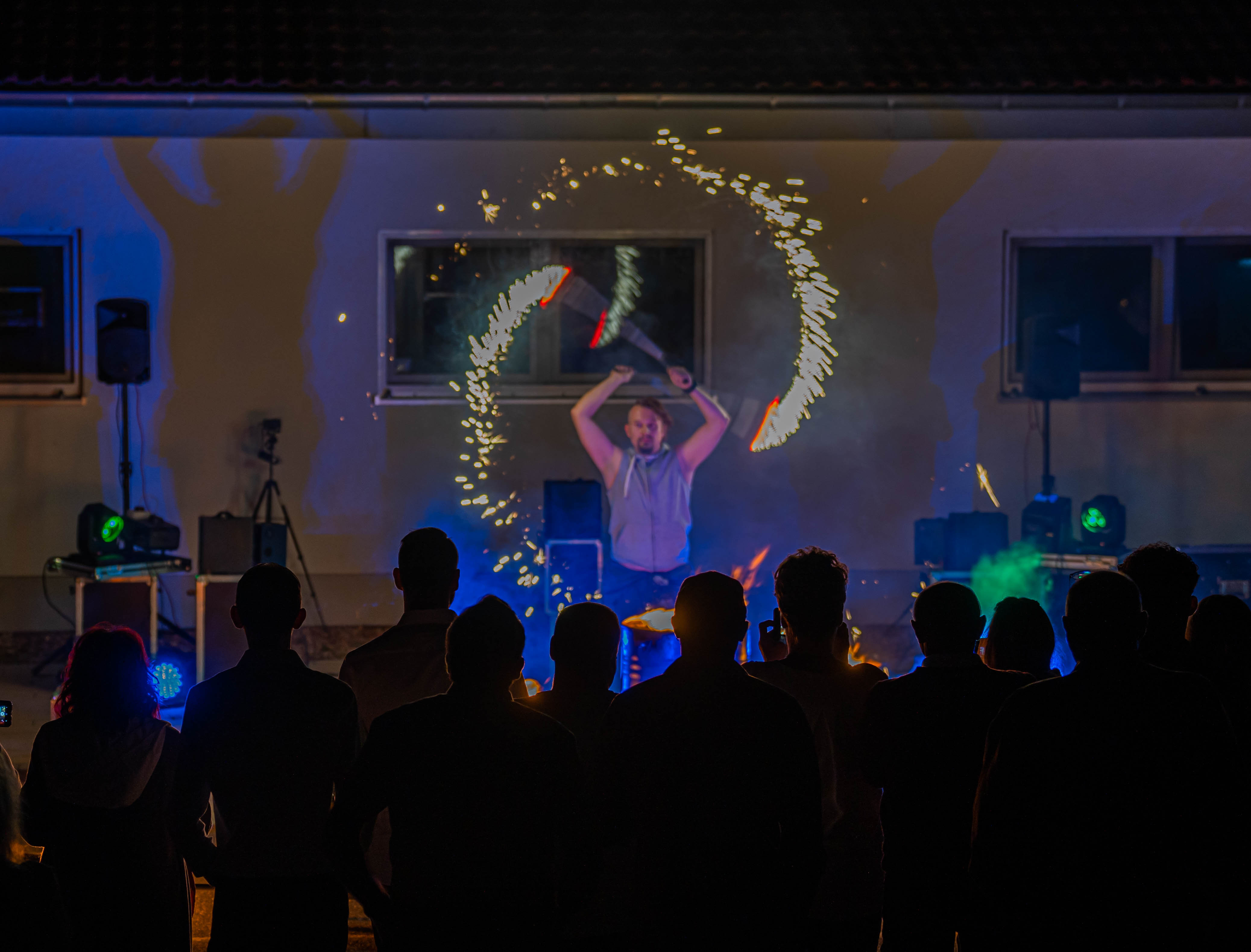 Für die exklusive Firmenfeier von Kühne + Nagel in Niedernberg durfte ich meine Show Industrial Fire präsentieren – eine Feuershow voller Energie, Präzision und Emotion. Auf dem weitläufigen Gelände des Golfplatzes entstand eine Bühne aus Licht, Flammen und Funken. Brennende Fässer verwandelten sich in rhythmische Instrumente, Funkenstürme erhellten die Nacht, und pulsierende Beats verbanden Feuer, Klang und Bewegung zu einem eindrucksvollen Erlebnis.