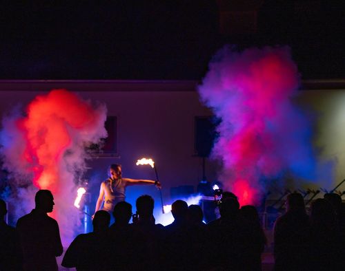 Besonders herausfordernd war die sensible Location: Der Untergrund musste trotz intensiver Effekte sauber und unversehrt bleiben. Durch sorgfältige Planung, speziell abgestimmte Materialien und eine gründliche Nachbereitung mit Industriestaubsauger konnte ich garantieren, dass nach dem letzten Funken kein Rückstand blieb. So stand der beeindruckenden Show nichts im Wege – sicher, kontrolliert und professionell umgesetzt.